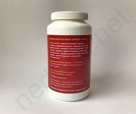 Гриб кордицепс китайский (Cordiceps chinensis) - род спорыньевых грибов. Обитает на личинках бабочек из семейства тонкопрядов в районе Тибета. Споры кордицепса, попадая на бабочку или на покровы личинки тонкопряда, прорастают. Пораженная личинка зарывается в землю. Гифы гриба развиваются в насекомом и заполняют всё тело хозяина. Когда заканчиваютя запасы личинки, кордицепс вынужден переходить на питание корневищами высокогорных растений: астрагалом, горцем, офиопогоном и др. Летом кордицепс прорастает цилиндрическими плодовыми телами черного цвета, выходящими всегда из головы насекомого, и вышеописанный цикл повторяется снова. Это легко объясняет китайское название кордицепса «Дун чун ся цао», что означает «зимой – насекомое, летом – трава». Ткани убитых кордицепсом насекомых не разлагаются и не заселяются бактериями. Это обусловлено наличием в тканях насекомого – хозяина природного антибиотика – кордицепина, образованного грибом. Многочисленными исследованиями доказано, что кордицепс стимулирует активность Т-лимфоцитов, естественных киллеров (NK-клеток), клеток мононуклеарно-макрофагального ряда, а также усиливает секрецию лимфы. Под воздействием кордицепса активизируется дифференцировка стволовых кроветворных клеток, тканевых фибробластов, усиливается пролиферация мегакариоцитов селезенки. Он активизирует работу гипоталамуса, гипофиза, повышает выделение гормонов, регулирует биохимические процессы организма.