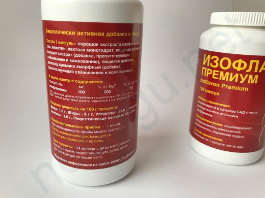 Препарат с максимальным содержанием изофлавонов сои, содержащим фитоэстрогены (структура подобна женским половым гормонам), разрешенного к применению на территории РФ и стран ЕС (капсула содержит 100% от верхнего допустимого уровня потребления согласно МР 2.3.1.1915-04).
