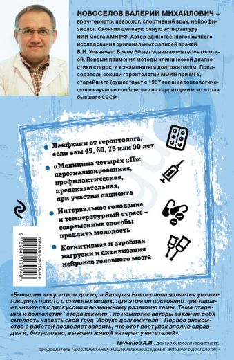 Любой профессиональный геронтолог скажет вам, что центральным стержнем темы долголетия является понимание механизмов старения homo sapiens. Однако именно они нам точно неизвестны. И, соответственно, невозможно воздействовать на то, что нам не совсем понятно. Тем не менее, за последние 50 лет ученые совершили настоящий прорыв в теме долголетия. Стволовые клетки, геропротекторы, антиоксиданты, наконец тренировки гипоксией… Что из этого профанация, а что действительно работает? Новая книга Валерия Новоселова – настоящая азбука долгожителя – она включает абсолютно все аспекты темы, известные на сегодняшний день.